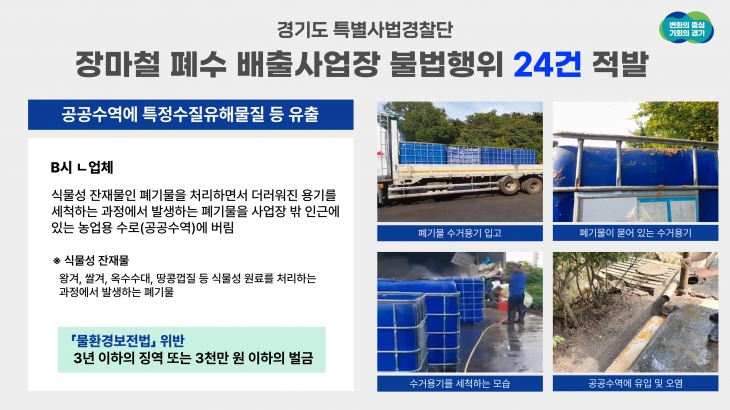 경기도 특별사법경찰단은 지난 7월 1일부터 31일까지 도내 31개 시군의 주요 폐수 배출사업장 380곳을 수사한 결과 23개 사업장에서 물환경보전법 위반 등 24건의 불법행위를 적발했다고 6일 밝혔다.