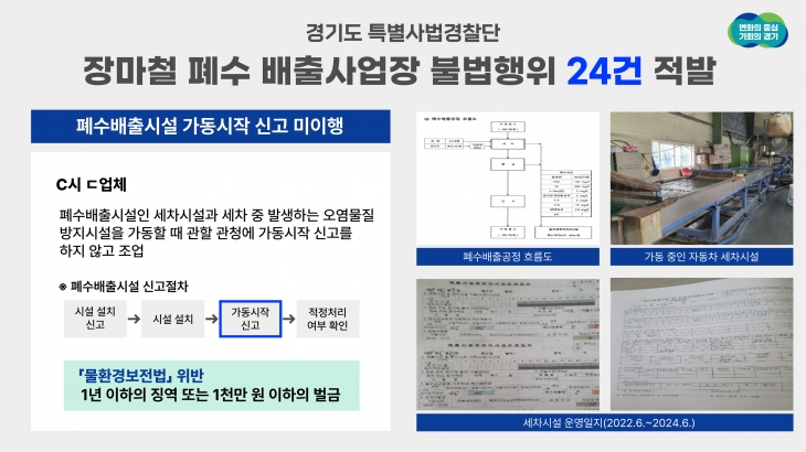 C업체는 폐수배출시설인 세차 시설과 세차 중에 발생하는 오염물질을 정화하는 방지시설을 가동하려면 관할관청에 미리 가동 시작 신고해야 하는데 이를 지키지 않고 조업한 사실이 확인됐다.