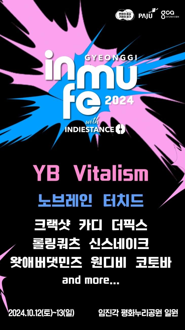 올해로 4회째를 맞는 ‘인뮤페’의 1차 라인업을 보면 YB, 노브레인, 크랙샷, 터치드, 카디, 롤링쿼츠, 신스네이크, 더픽스, 1DB(원디비), 왓에버댓민즈, 코토바 등 국내를 대표하는 뮤지션들이다. 무엇보다 국내 첫 내한을 앞둔 브라질 출신 Vitalism(바이탈리즘)이 해외 초청 아티스트로 첫 번째 무대에 오른다. 경콘진은 오는 23일 추가 라인업을 공개할 예정이다.