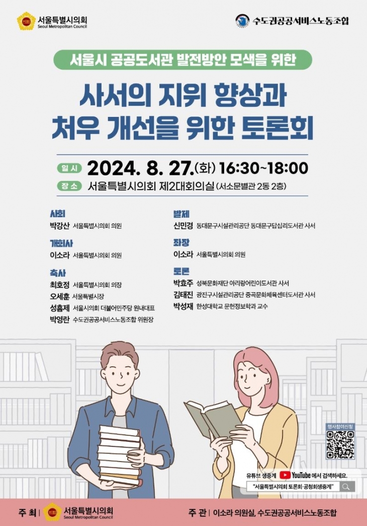 이 의원은 수도권공공서비스노동조합과 공동주관해 27일 오후 4시 30분 서울시의회 의원회관 2동 제2대회의실에서 ‘사서의 지위 향상과 처우 개선을 위한 토론회’를 개최한다.