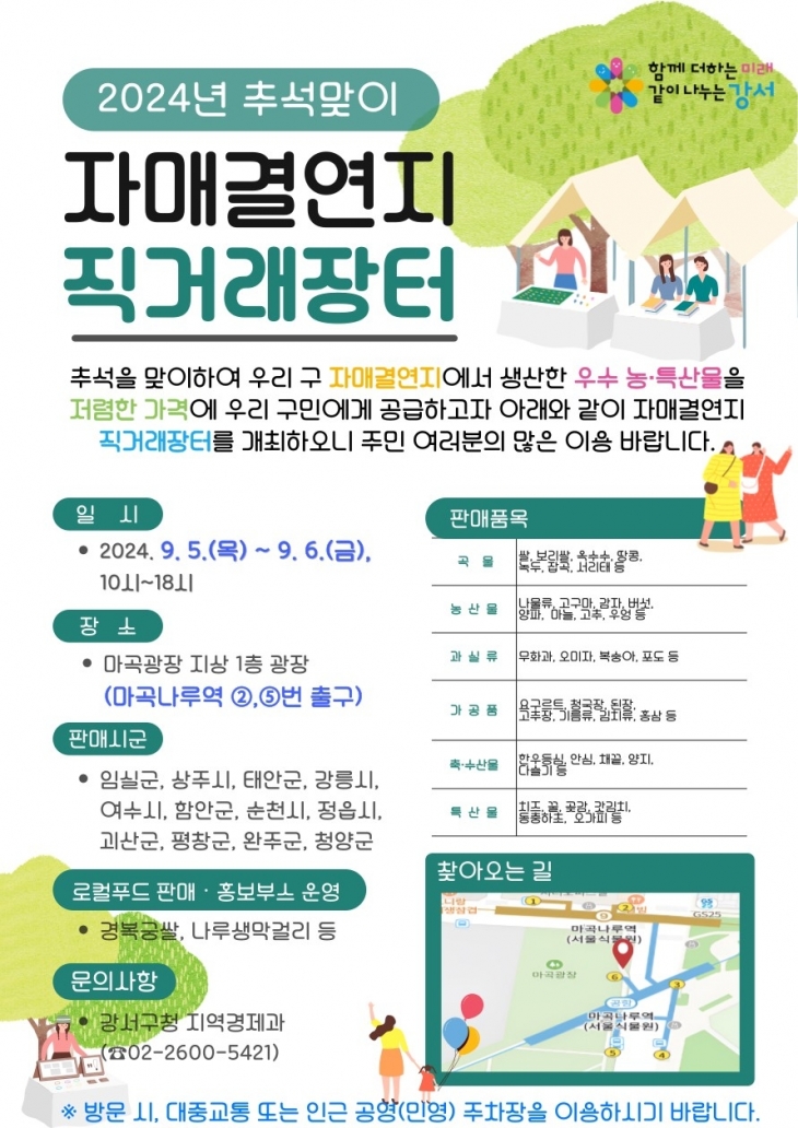 진교훈 강서구청장은 “지역 농가도 돕고 알뜰하게 명절을 준비할 수 있는 직거래장터에 주민 여러분의 많은 관심과 참여를 바란다”고 말했다.