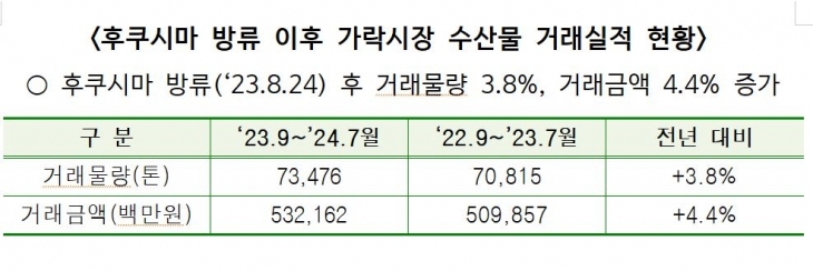 일본 후쿠시마 원전 방류 이후 1년간, 서울 가락시장 수산물 거래물량은 전년 대비 3.8%, 거래금액은 4.4% 증가하였다. 방류 이후의 논란에도 불구하고 시장의 동요는 없었다.