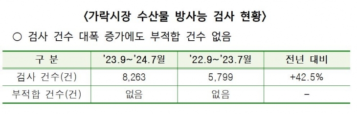공사가 제출한 자료에 따르면, 지난 1년간 후쿠시마 오염수 방류에 대비해 모든 종류의 수산물을 대상으로 식품전용 방사능 검사와 수산물 표면 오염도를 정밀 측정하는 감마핵종분석 검사 건수를 대폭 늘려 시행해 오고 있으나 부적합 의심 건수는 발견되지 않았다.