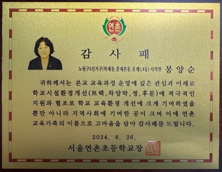 봉양순 서울시의원(더불어민주당·노원3)이 지난 26일 노원구 하계동 연촌초등학교에서 학교시설개선을 통한 교육환경개선 유공으로 ‘감사패’를 받았다.