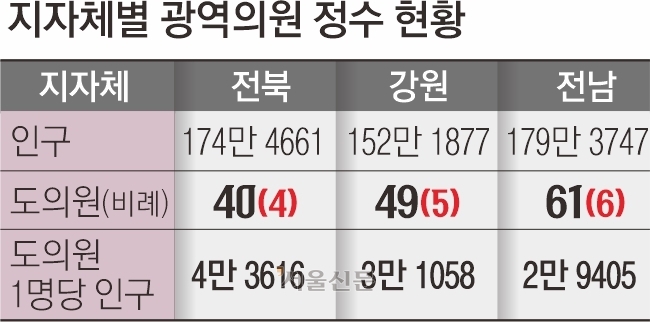 인구 4만 8500명인 전북 부안군은 인구 최저 하한선 5만명이 적용돼 도의원이 1명이지만 전남 보성·장흥·신안군은 인구가 3만 4000~3만 7000명 선임에도 2명씩이다. 인구가 4만명 선인 전남 담양·장성·완도군과 강원 평창·철원군도 도의원 정수가 2명이다.