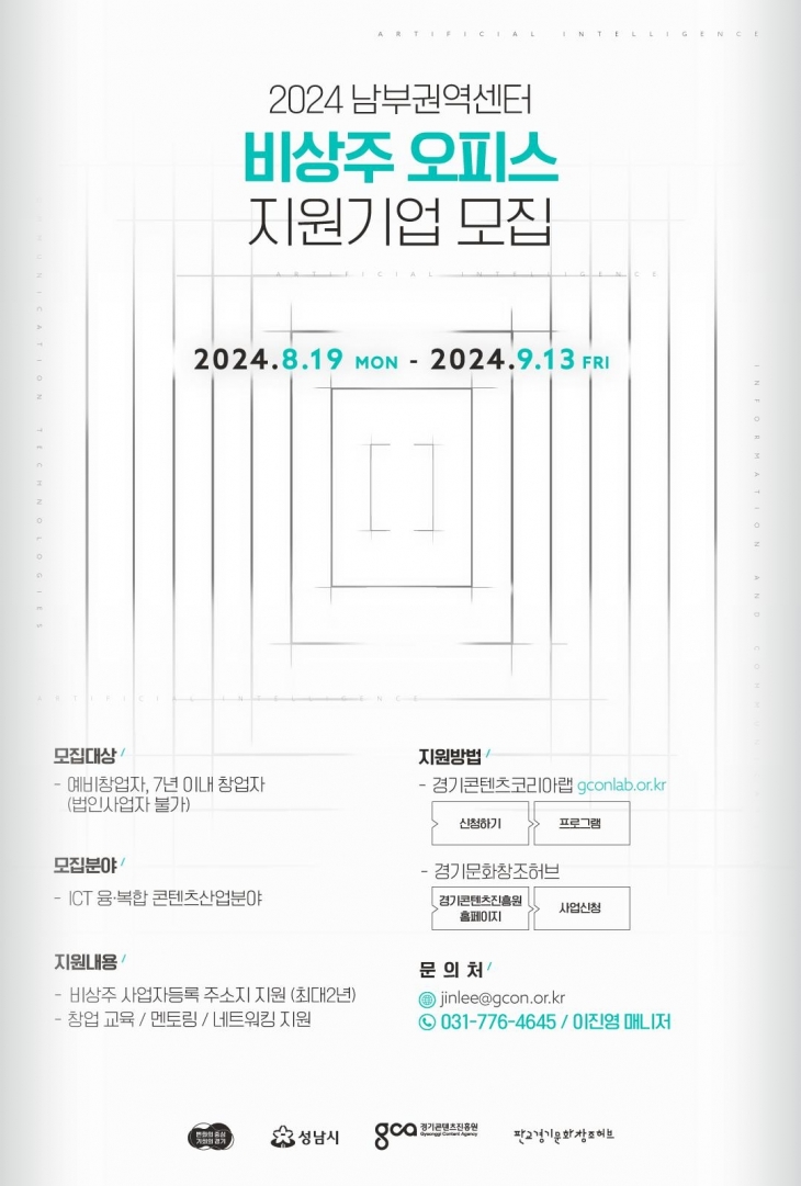 경기콘텐츠진흥원(원장 탁용석, 이하 경콘진)은 콘텐츠 분야 창업자가 사업자 등록에 필요한 가상 주소지를 무료로 제공받을 수 있는 ‘경콘진 남부권역센터(판교) 가상 사무실 지원사업’ 참여 기업 20팀을 9월 13일까지 모집한다.