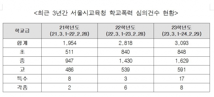 황 의원이 서울시교육청에서 받은 자료에 따르면, 2021학년도 1954건이었던 학교폭력 심의건수는 23학년도에 3093건으로 1000건 이상 늘었다. 코로나로 인해 대면 일수가 적었던 시기를 고려하더라도 급격히 늘고 있다.