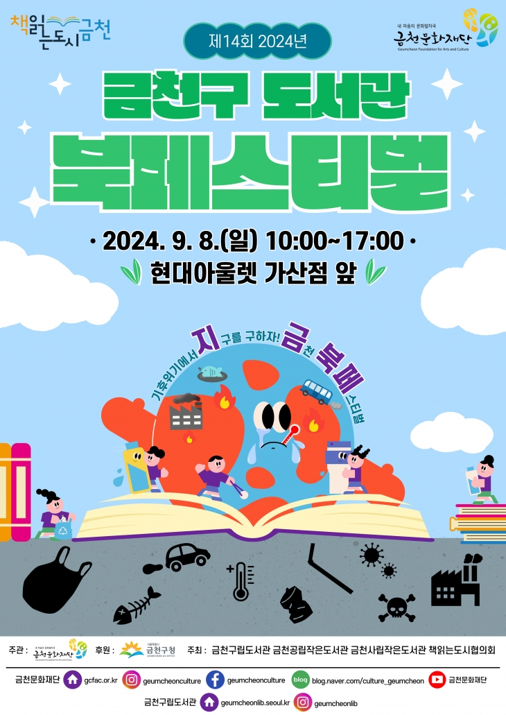 금천구 관계자는 “올해 주제는 ‘기후 위기로부터 지구를 구하자! 금천, 북 페스티벌’을 줄인 ‘지금북페’”라며 “환경과 기후변화에 대해 함께 고민하고 행동하며 쓰레기 없는 지구를 만들자는 취지”라고 설명했다. 지역 내 도서관별로 준비한 도서 전시와 문화 행사, 가상현실(VR) 체험, 금천패션영화제 연계 프로그램, 음악 공연 등 풍성한 놀거리를 만날 수 있다.