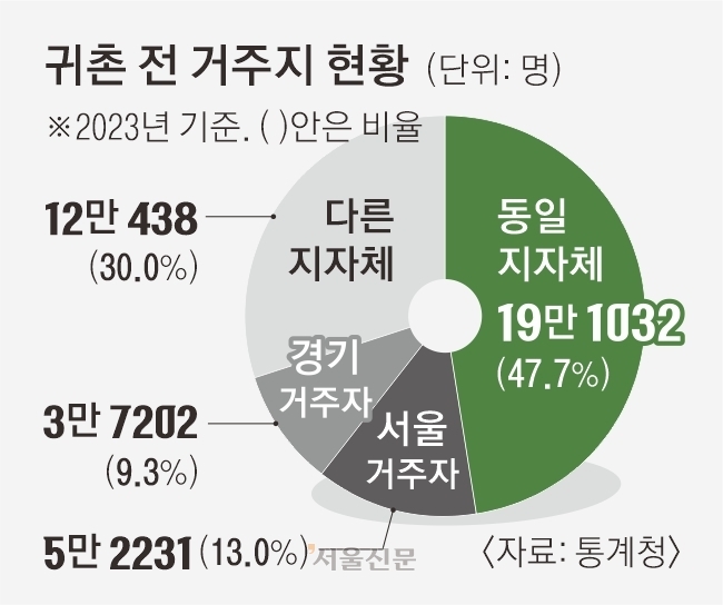 11일 통계청의 2023년 귀촌 현황 분석 결과 지난해 귀촌인 40만 903명의 47.7% 19만 1032명의 전 거주지가 동일한 광역지자체인 것으로 조사됐다. 관내 귀촌 비율은 대구가 71.4%로 가장 높았고 부산 65.7%, 전북 64.1%, 경기 57.4%, 울산 51.9%, 경남 50.7% 순이었다. 이 같은 귀촌은 동일 광역지자체 내에서 주소만 옮기는 것으로 인구증가 효과가 없다. 제주도 역시 동일 광역지자체 내 귀촌이 42%나 됐고 경북 41.2%, 강원과 충남 각각 37.9%, 충북 36.5%, 전남 34.9% 등으로 10명 중 3~4명은 같은 지역 거주자였다. 특히, 서울에서 지방으로 거주지를 옮긴 귀촌인은 5만 2231명으로 13.03%에 그쳤다. 게다가 50%, 2만 6137명은 경기도에 귀촌한 것으로 조사됐다. 서울 귀촌인의 절반이 수도권에 둥지를 튼 셈이다.