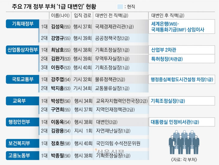 반면 1급 대변인 인기가 시들한 부처도 있다. 국토교통부 강주엽(54·기술고시 32회) 전 대변인은 지난 6월 행정중심복합도시건설청 차장(1급)으로 수평 이동했다. 후임 박지홍(53·기시 34회) 대변인도 국토부 실장급 중 막내다. 내부에선 “대변인이 2급이든 1급이든 큰 변화를 일으키긴 어렵다”는 얘기도 나온다.