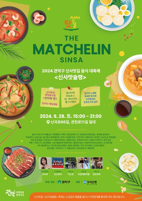 신사맛슐랭은 관악구 신사동 신사맛길에서 열리는 관악구의 음식문화 축제이다. 이날 오후 3시부터 9시까지 열린다. 관악구 관계자는 “서울시 야간·음식문화 활성화 지원사업 공모에 선정된 결과 지역 상권에 활기를 불어넣기 위해 축제를 기획했다”고 설명했다.