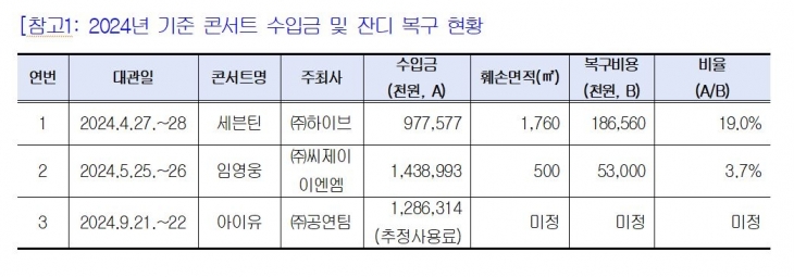 그라운드석을 판매한 세븐틴 콘서트는 경기장 전체 잔디 면적 9126㎥을 대부분 사용하고도 19%에 해당하는 면적만 복구를 진행한 것으로 나타났다.