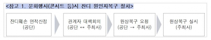서울월드컵경기장은 콘서트로 인한 잔디 훼손 시, 주최사에 복구 의무를 부담시키고 있는데, 잔디 훼손 면적산정은 공단에서 실시하고 원상복구는 주최사에서 수행한다.