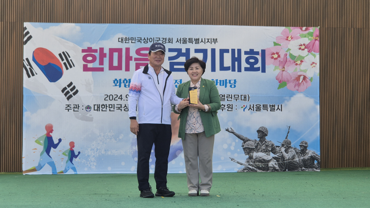 서울특별시의회 보건복지위원회 김영옥 위원장(국민의힘, 광진3)은 지난 9월 25일 대한민국상이군경회 서울시지부에서 개최한 ‘2024 한마음걷기대회’에 참석하여 상이군경에 대한 복지 향상에 이바지한 노력을 인정받아 감사패를 전달받았다.