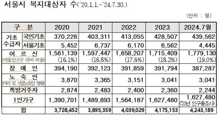 특히 서울시의 국민 기초생활수급자의 경우 2020년 37만 226명에서 2024년 43만 9562명으로 18.7% 이상 증가했으며, 어르신 또한 156만 1139명에서 177만 9130명으로 20만명 이상 가파르게 증가한 것으로 나타난다.