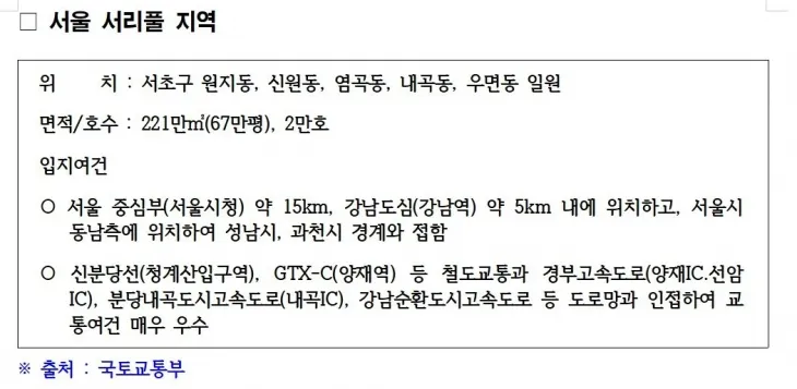 서리풀 지역, 고덕강일 1.3배 면적, 둔촌주공 1.7배 물량 공급