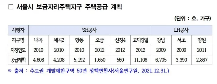 이전에는 이명박 정부 시절, 수도권에서 총 4차례에 걸쳐 보금자리주택지구 17개소를 대규모로 지정한 적이 있다. 당시 서울시 내 보금자리주택지구는 총 9개 지구로 그린벨트 502.5만㎡를 해제해 총 4만가구를 공급했다(수도권 개발제한구역 50년 정책변천사, 서울연구원, 2021.).