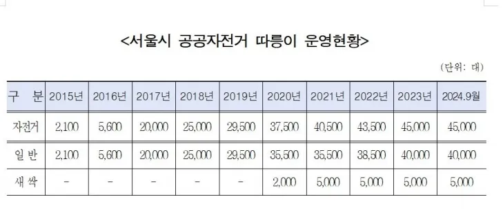 지난 2010년 11월 서울시 시범 운영으로 시작된 공공자전거 따릉이는 400대로 시작해 2024년 9월 기준 일반 4만대 및 새싹 따릉이 5000대 총 4만 5000대로 크게 확대됐며 한해 이용 횟수는 4000만건에 육박하는 등 서울시 대표적인 공공정책이 됐다.