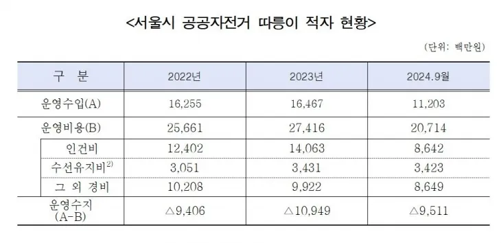 하지만 따릉이 적자는 해마다 증가 추세에 있다. 운영수입에서 운영비용을 제외한 운영수지는 2022년(94억 600만원), 2023년(109억 4900만원) 2024년 9월 기준(95억 1100만원)으로 최근 3년간 따릉이 적자는 매년 평균 약 100억원에 육박한다.