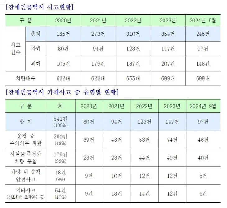 이경숙 서울시의원(국민의힘·도봉1)이 서울시설공단으로부터 제출받은 자료에 따르면 2020년부터 2024년 9월까지 발생한 장애인콜택시 사고는 1367건이다. 이 중 가해 사고는 541건을 차지했다.