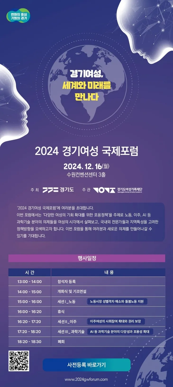 경기도가 ‘여성의 기회 확대를 위한 포용정책’을 주제로 국내외 여성 전문가들과 정책방향을 모색하는 ‘2024 경기여성 국제포럼’을 12월 16일 수원컨벤션센터에서 개최한다. 광역자치단체 최초의 여성정책 국제행사이다.