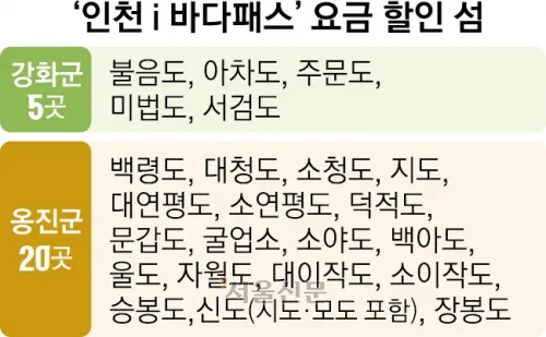 할인 대상 여객선은 인천 내륙과 섬을 연결하는 14개 항로를 운행 중인 16척이다. 별도 신청 절차 없이 인터넷 예약이나 여객 터미널에서 발권할 때 자동으로 할인 요금이 적용된다.