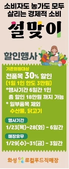 화성푸드통합지원센터는 오는 23일부터 28일까지 6일간 화성로콜푸드직매장에서 ‘설맞이 30% 할인행사’를 진행한다고 22일 밝혔다.