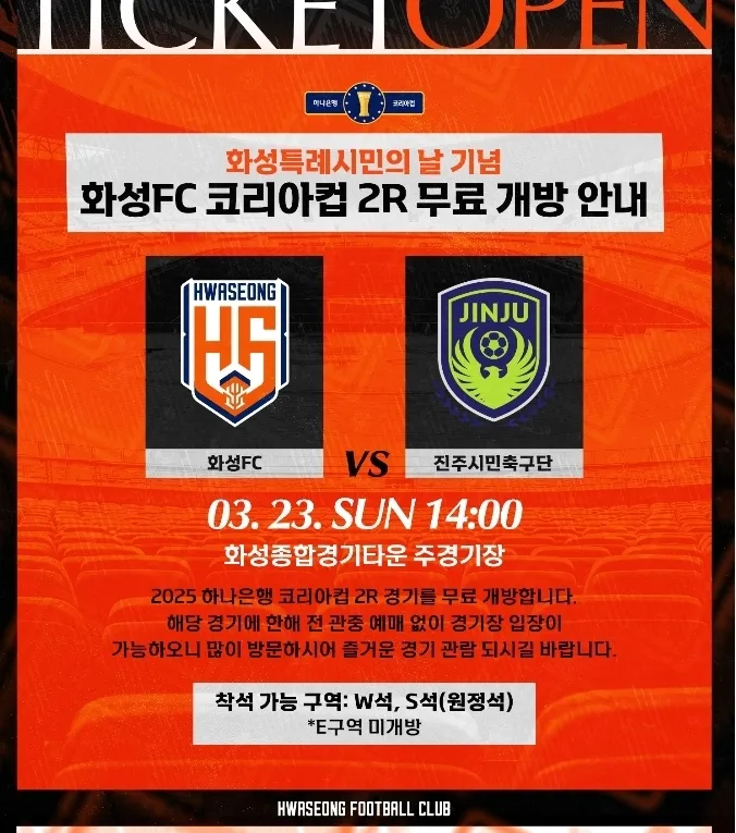 화성특례시가 화성특례시민의 날을 맞아 오는 23일 화성종합경기타운 주 경기장에서 열리는 화성FC와 진주시민축구단의 ‘2025 하나은행 코리아컵’ 2라운드 홈경기 입장료를 받지 않는다.