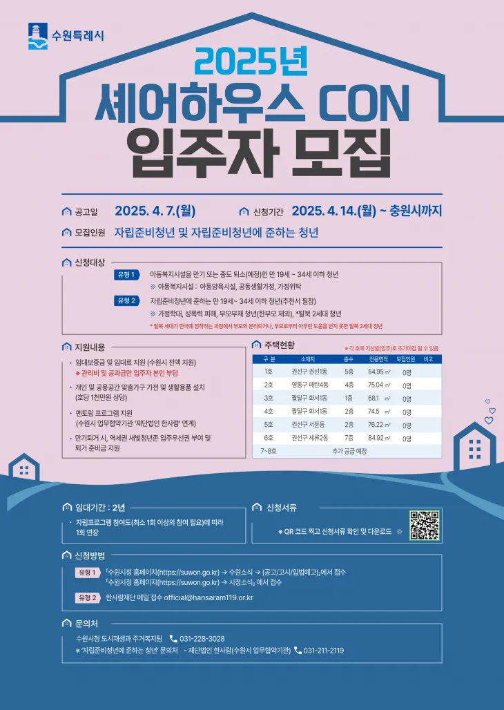 수원시는 올해부터 셰어하우스 CON 입주 대상을 34세 이하 무주택 청년이면서 양육시설 퇴소(예정) 보호종료청년(1순위), 자립준비청년에 준하는 청년(2순위)으로 확대했다. 기존 대상은 ‘29세 이하 무주택 보호종료청년’이었다.