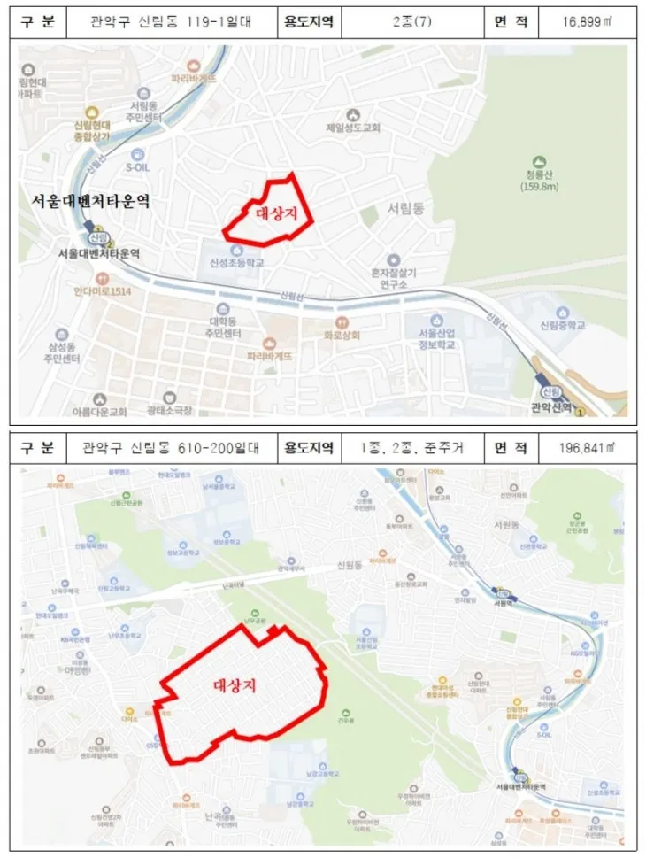 이번에 재개발 후보지로 선정된 지역은 ▲신림동 610-200번지 일대(법원단지1)와 ▲신림동 119-1번지 일대(일명 고시촌 일대)로, 반지하 주택과 좁은 골목이 밀집한 노후 저층 주거지로 오랜 기간 도시기능 저하 및 주거환경 개선의 필요성이 지속적으로 제기되어 온 지역이다.