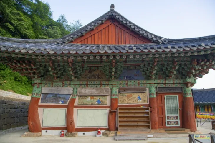 정면에 대웅보전, 좌측에 지장전이 자리하고 있다. 대웅보전에는 3개의 석가모니불이 모셔져 있다. 붉은색으로 치장한 수미단이 매우 화려하다. 특히 법당 천장을 청룡과 황룡이 감싸고 있어서 웅장하면서도 신비로움을 자아낸다. 대웅보전의 외벽에는 석가모니의 일생을 그림으로 표현한 벽화가 그려져 있다.