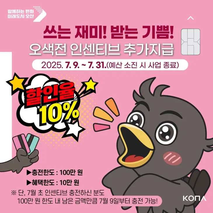 오산시, 오색전 충전 한도 30만 원→100만 원···최대 10만 원 혜택