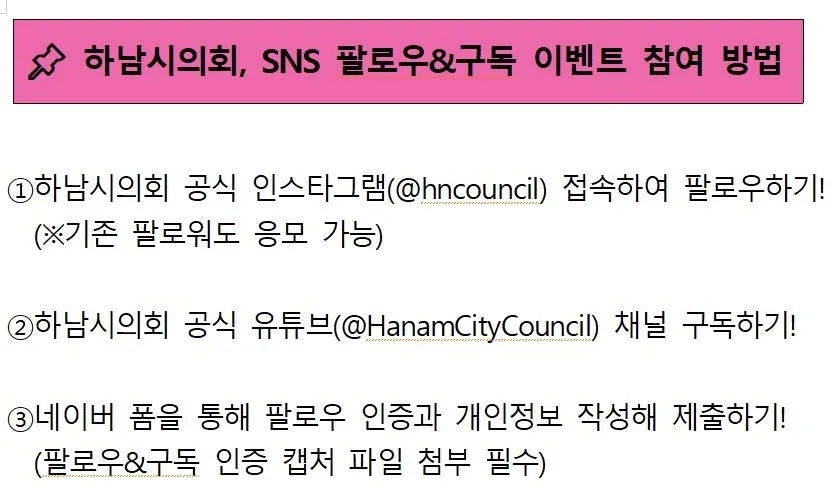 오는 20일까지 14일 동안 진행되는 SNS 팔로우&구독 인증 이벤트 참여 방법은 하남시의회 공식 SNS 채널(인스타그램, 유튜브, 블로그)을 팔로우 또는 구독한 뒤 화면을 캡처해 인증하는 방식으로 누구나 참여할 수 있다.