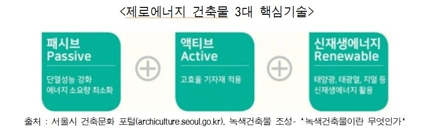 **제로에너지건축물(Zero Energy Building) : 녹색건축물의 한 종류로, 건축물에 필요한 에너지 부하를 최소화하고 신에너지 및 재생에너지를 활용하여 에너지 소요량을 최소화하는 건축물.(녹색건축법 제2조)