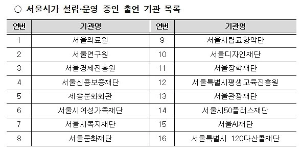 현재 서울시는 문화·예술·장학·체육·의료·연구·금융·여성·복지·관광 등 서울시민의 복리증진 및 지역개발 활성화에 이바지할 수 있는 분야에서 총 16개의 출연 기관을 설립·운영하고 있다.