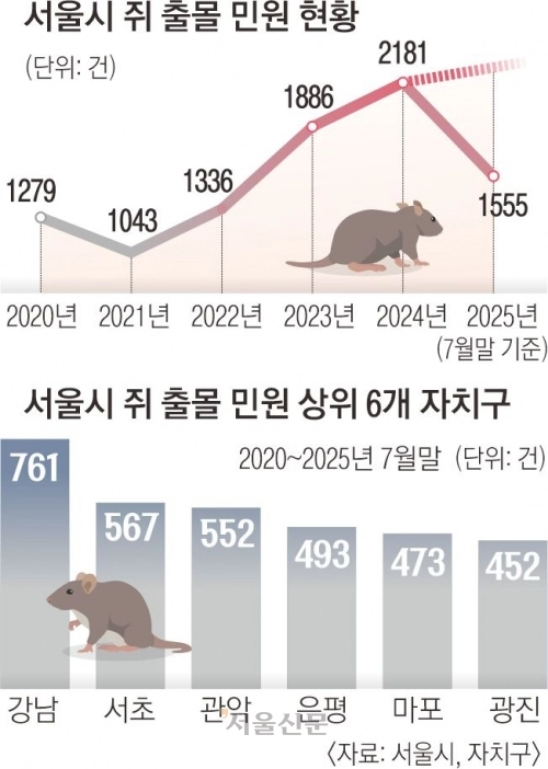 쥐 떼 공포는 통계로도 심각하다. 23일 서울시에 따르면 시내 쥐 출몰 민원 건수는 2021년 1043건에서 꾸준히 증가해 지난해 2181건으로 두 배 넘게 치솟았다. 올해도 7월 말 기준 벌써 1555건이 접수됐다. 강남·서초·관악구 등 특정 자치구에 민원이 집중됐다.