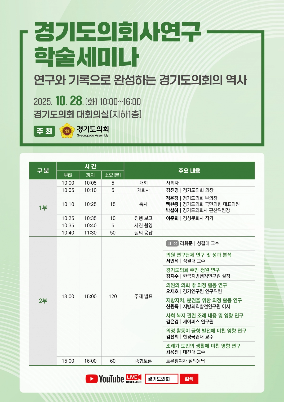이어 “기록은 단순한 과거의 회상이 아니라 미래를 위한 약속”이라며 “이번 학술세미나가 학술적 논의에 머물지 않고, 경기도의회의 미래를 여는 실질적 동력이 되도록 최선을 다하겠다”고 강조했다.
