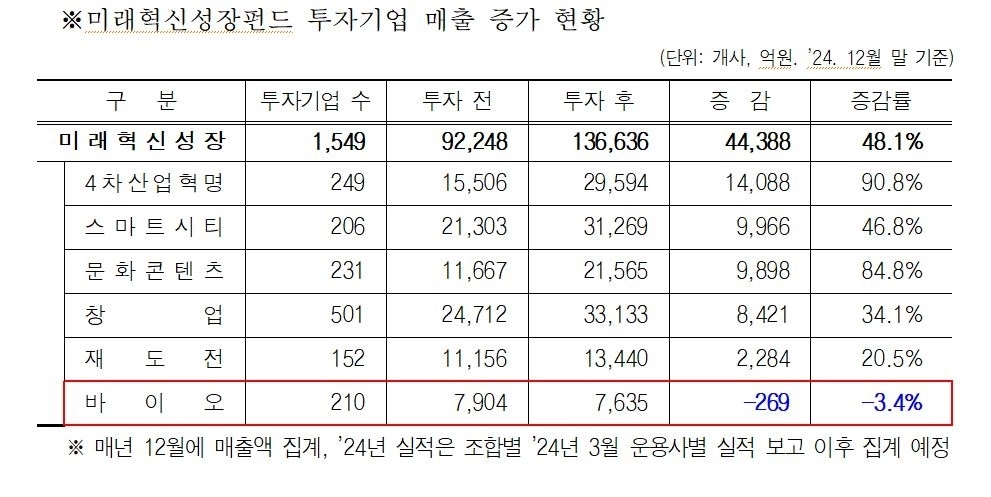 미래혁신성장펀드의 바이오 분야는 210개 기업에 투자했으나, 투자 전 7904억원이던 매출이 투자 후 7635억원으로 269억원 감소(-3.4%)했다. 이는 미래혁신성장펀드 내 7개 분야 중 유일하게 마이너스 성장을 기록한 것이다.