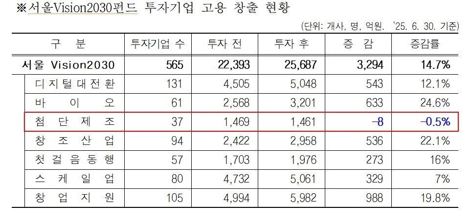 서울비전2030펀드의 첨단제조 분야 역시 37개 기업에 투자했으나, 투자 전 1469명이던 고용이 투자 후 1461명으로 8명 감소(-0.5%)하며 역성장했다.
