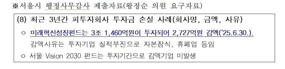 서울시의회 왕정순 의원(더불어민주당, 관악구 제2선거구)은 2025년 기획경제위원회 행정사무감사에서 서울시가 전략적으로 추진한 미래혁신성장펀드와 서울비전2030펀드의 핵심 분야가 오히려 역성장하고 있으며, 2727억원의 막대한 손실이 발생했음에도 상세 내역 제출을 거부하고 있다고 비판했다.