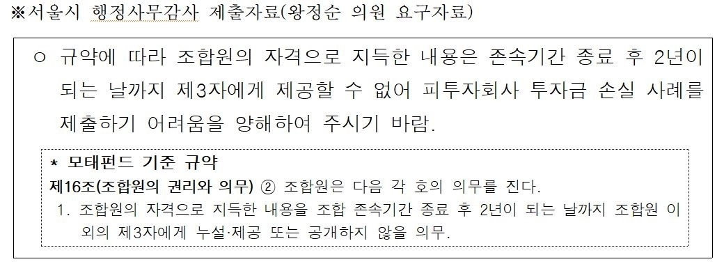 왕 의원은 “펀드 운영의 특성상 일부 비밀유지의 필요성은 인정하더라도, 시민의 대의기관인 의회의 기능을 존중해 핵심 자료는 제출하는 것이 마땅하다”면서 “조합원 간의 규약이 아닌, 자료 제출을 거부할 수 있는 상위 법령을 제시하라”고 촉구했다.