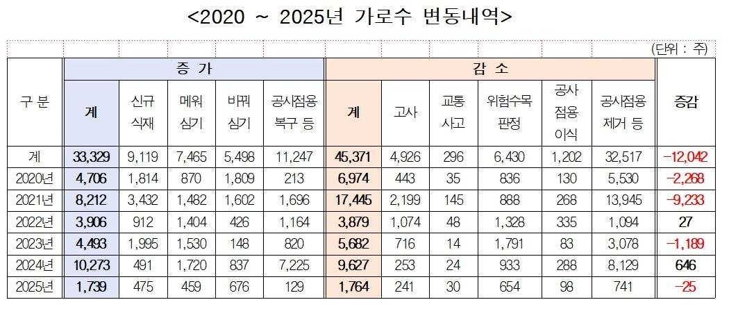서울시 자료에 따르면 2020년부터 2025년 8월까지 가로수 3만 3329그루가 심어졌지만 4만 5371그루가 사라져, 순감소가 1만 2042그루에 달했다. 이는 2019년 약 30만 7000그루였던 가로수가 5년 새 29만 4668그루로 줄어든 것이다.