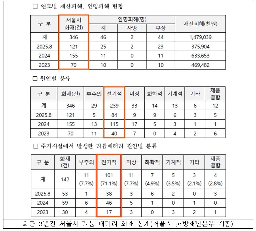 이에 대해 소방재난본부(홍영근 본부장)는 “문제의식에 공감하며, 리튬배터리 화재 예방을 위한 국가 차원의 제도 개선을 건의하는 동시에, 서울시 차원에서도 화재위험지역 정보 공유, 관련 부서 협업, 통계 기반 대응 강화 등 다각적인 대책을 추진하겠다”고 밝혔다.