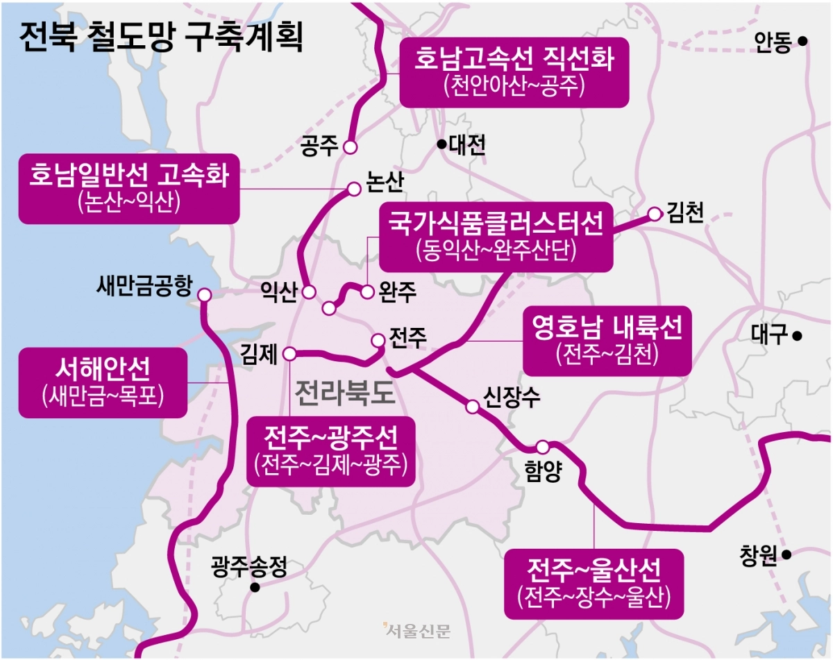 신규 발굴사업은 호남고속선(천안아산~공주 55.3㎞) 직선화, 호남일반선(논산~익산 12.5㎞) 고속화, 전주~광주선(김제~전주 27.8㎞), 전주~울산선(244.1㎞)이다. 전라선 고속화는 선로 개량과 선형 개선으로 운행 효율성과 속도를 높이는 게 목표다. 이번 국가계획과 별도로 새만금 신항~새만금국제공항~대야를 잇는 새만금 인입철도(48.2㎞)는 내년 상반기 기본계획이 확정된다.