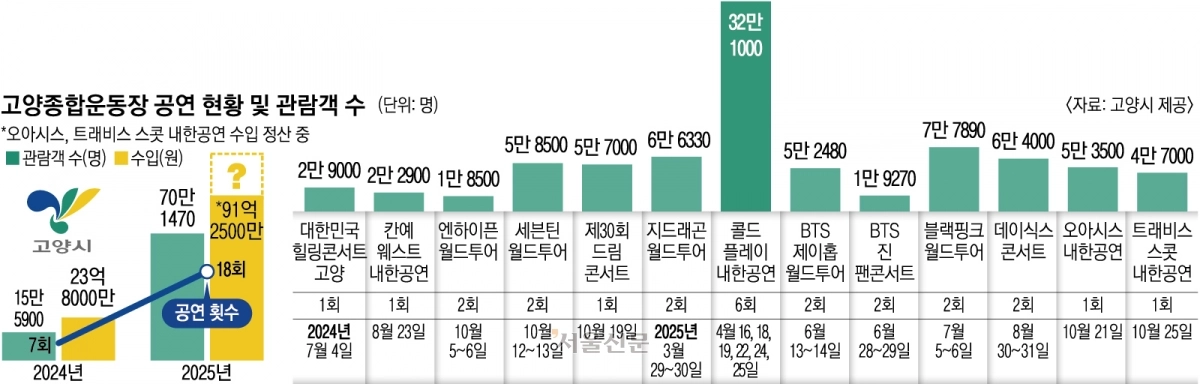 올해는 성과가 수치로 나타났다. 고양종합운동장에서 열린 공연은 총 18회, 관객 수는 약 70만명에 달했다. 공연 수입은 91억원을 기록했고, 지난달 열린 오아시스와 트래비스 스콧 공연 수입까지 포함하면 100억원 돌파가 확정적이다. 개장 이후 처음으로 유지관리비를 뛰어넘는 수익을 내면서 적자 구조에서 탈피한 것이다. ‘비어 있던 경기장이 도시의 수익 자산으로 바뀌었다’는 평가가 나온다.