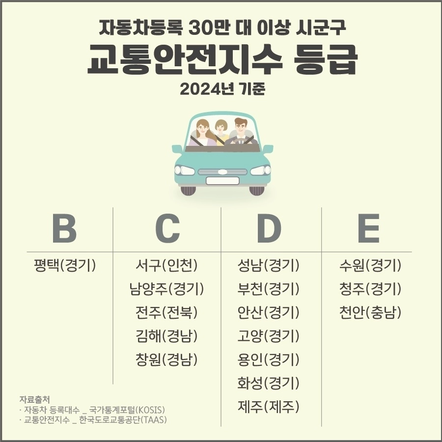 자동차등록 30만 대 이상 전국 시군구 중 경기 평택시의 교통안전지수 등급이 가장 높은 것으로 나타났다.