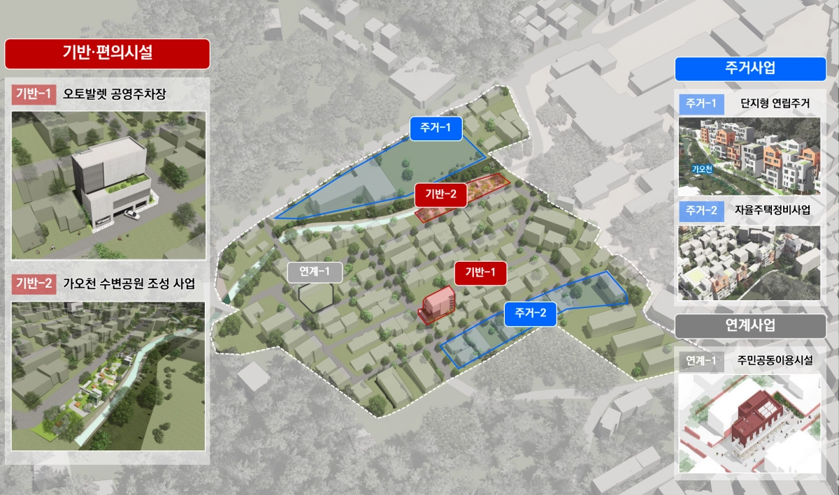 인수봉숲길마을에는 국토부의 뉴빌리지 선도사업과 함께 서울시의 휴먼타운 2.0을 연계해 ▲소규모 신축·리모델링 지원 ▲특별건축구역 및 건축협정 집중구역 지정 ▲이차보전 금융지원 등을 통해 주민이 체감하는 주거환경 개선을 추진한다. 총 185억원을 투입하여, 오토발렛 공영주차장과 가오천 수변공원 조성, 개별 주택정비 활성화 등을 추진하여 주거환경 개선과 함께 생활편의도 향상될 예정이다.