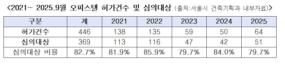 그동안 오피스텔은 청년·사회초년생 등 소형 주거수요가 꾸준히 증가하고 있음에도, 소규모 사업까지 일률적으로 건축심의를 받도록 규정돼 인허가 지연과 행정 부담이 과도하다는 지적이 지속적으로 제기돼 왔다. 실제로 최근 5년간 서울시 오피스텔 허가 건수 중 약 80% 이상이 건축심의 대상에 해당해, 주거공급 확대의 구조적 걸림돌로 작용해 왔다.