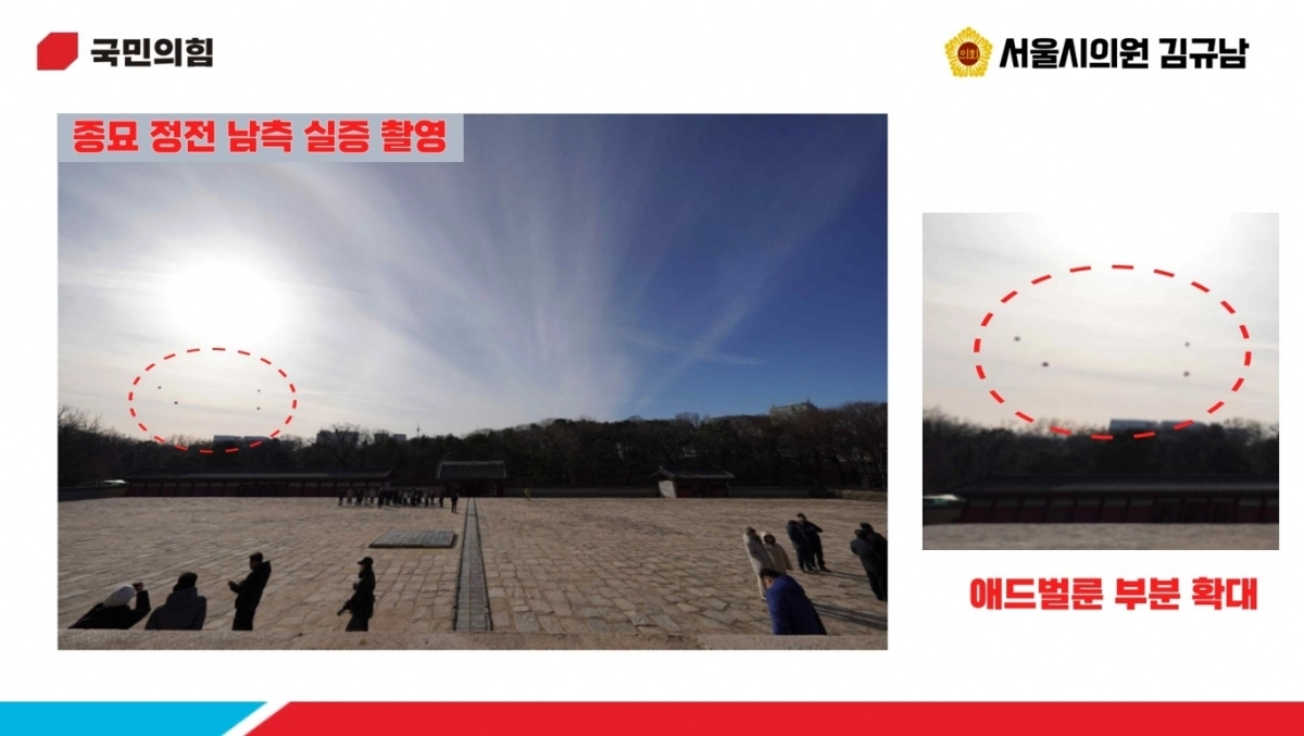 김 의원은 서울시에 요청해 확보한 자료를 근거로, 서울시가 세운4구역 현장에서 실제 계획된 건축물 높이(종로변 약 99m, 청계천변 약 142m)에 맞춰 애드벌룬을 띄워 동일한 위치(종묘 정전 상월대)와 시야각에서 촬영한 실증 결과를 보여주며, 애드벌룬의 높이와 일전의 서울시가 공개한 시뮬레이션의 건축물 높이와 거의 다르지 않음을 밝혔다.