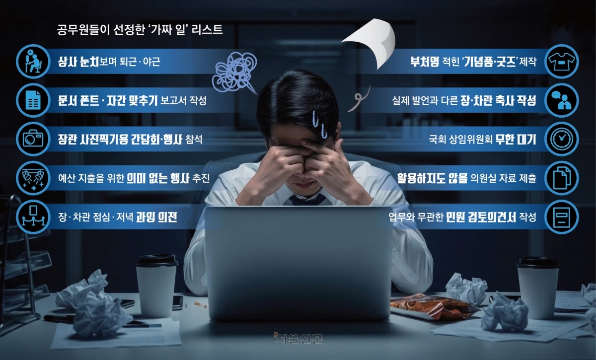 상사의 눈치를 보며 퇴근을 미루고 야근하는 관행도 대표적인 ‘가짜 일’로 꼽혔다. 경제부처 한 과장급 공무원은 “민간 기업처럼 일정 시간이 되면 컴퓨터를 강제 종료를 시키는 조치가 공직 사회에도 필요하다”고 말했다.